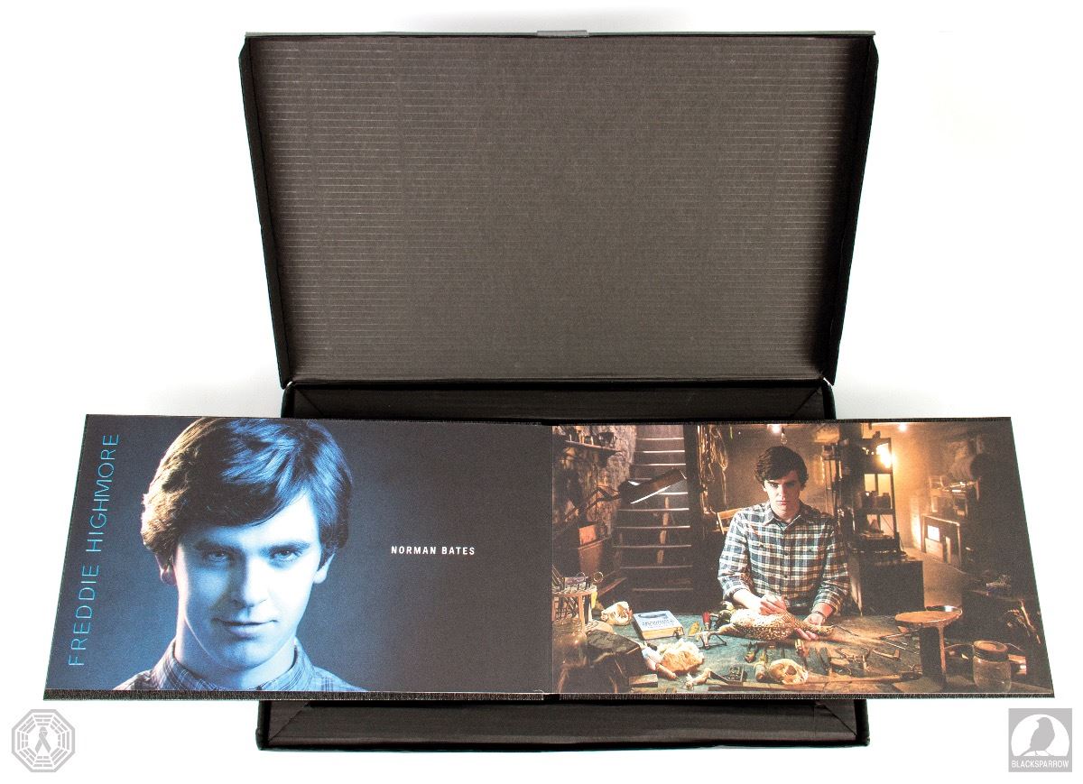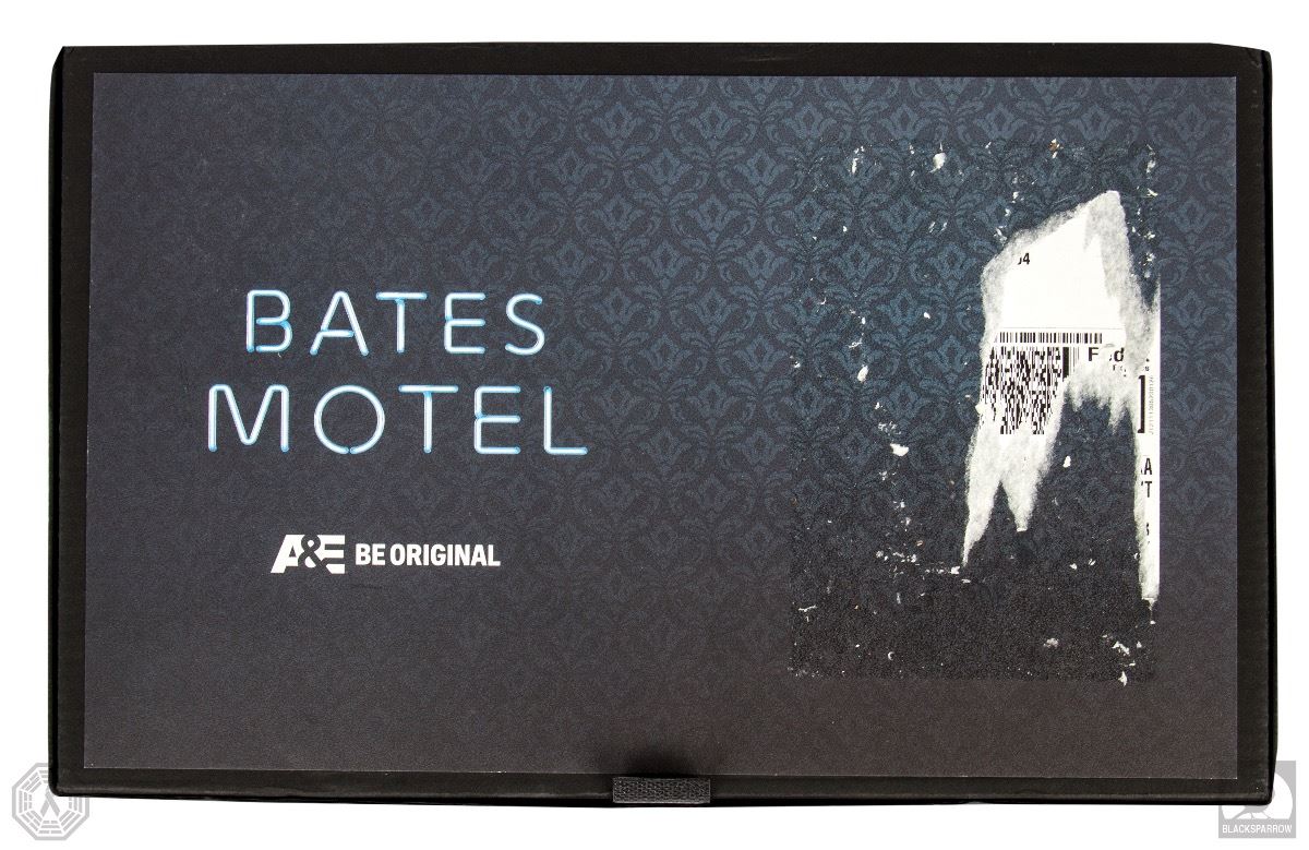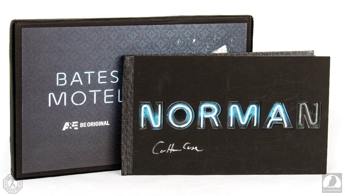 Bates Motel Season Two official A&E press kit with metallic cover. Signed on the cover by Executive Producer Carlton Cuse. Comes with original case. Press screener DVD not included. The case has glue residue remnants from a FedEx label. Minimal wear and remains in fine condition. Donated by Danielle T.