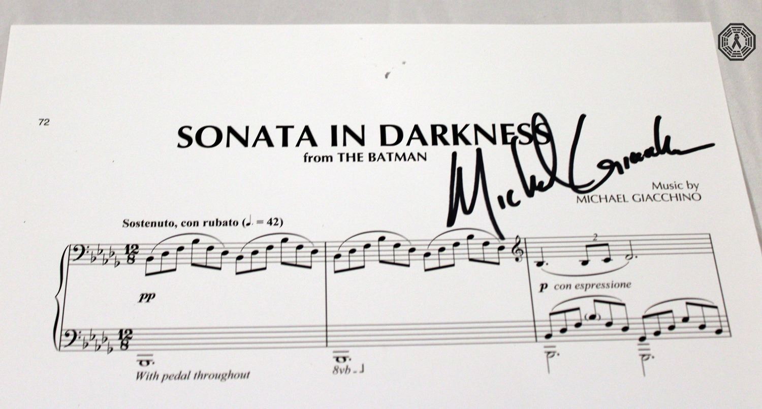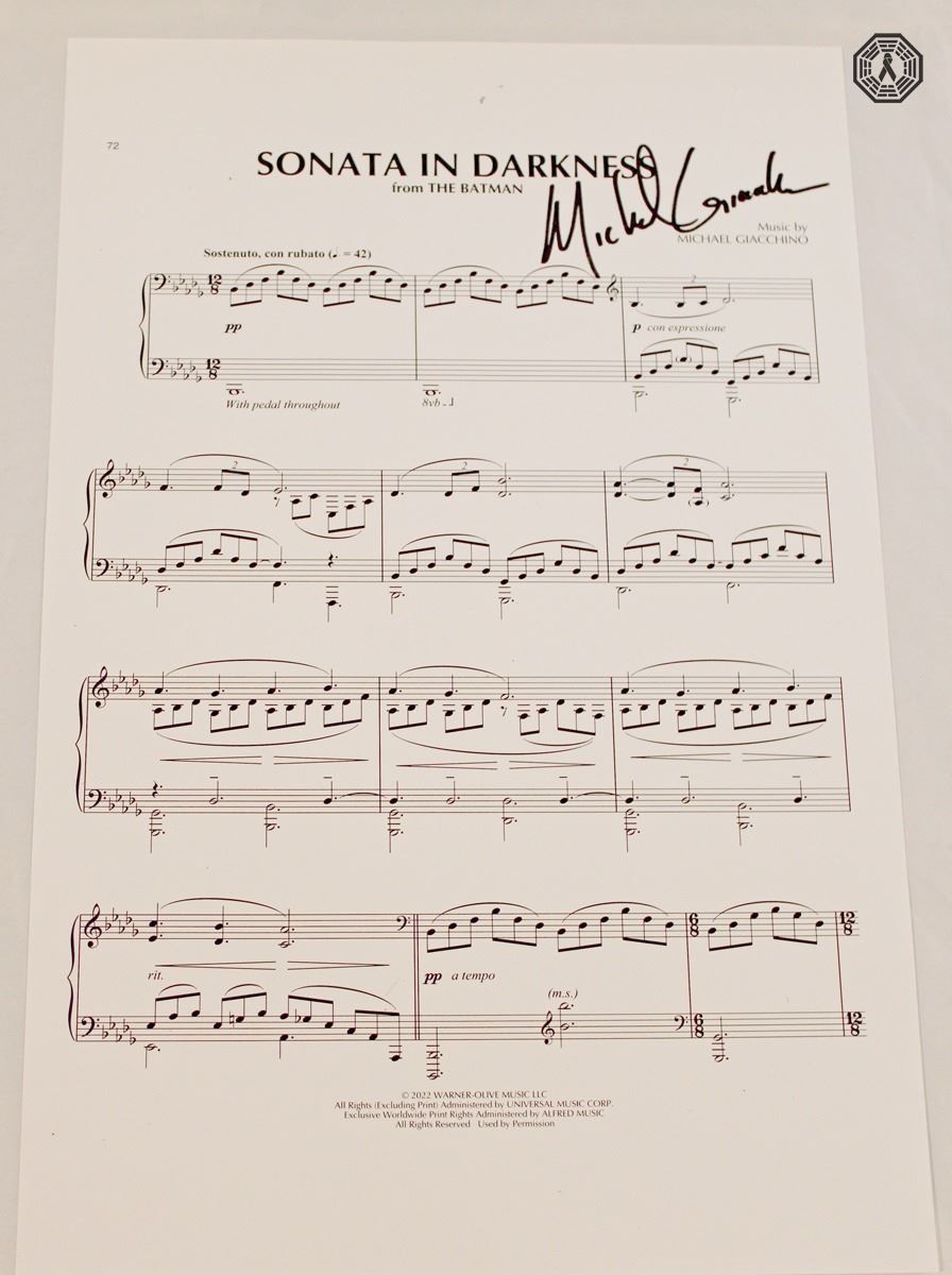 The Batman (2022 film) sheet music: "Sonata in Darkness" score. Music composed by Michael Giacchino, who kindly donated and signed this very rare collectible for CGL!