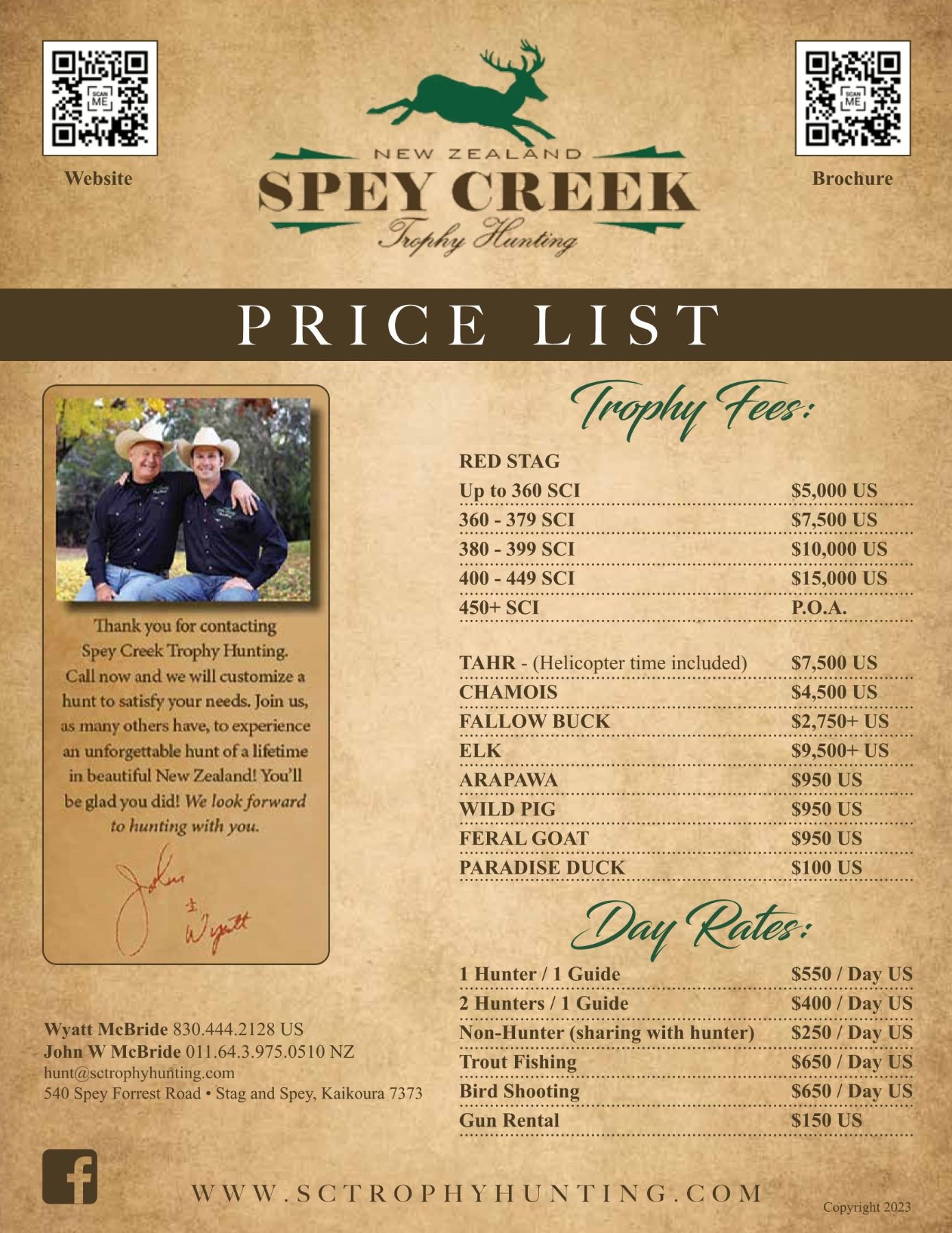 This hunt is available March-July 2026 or 2027 and may be upgraded to include additional red stag, tahr, elk, chamois, fallow buck, South Pacific black-faced Arapawa ram, feral goat, hogs and sightseeing days at the current price list. Additional hunters and non-hunters are welcome at current rates.