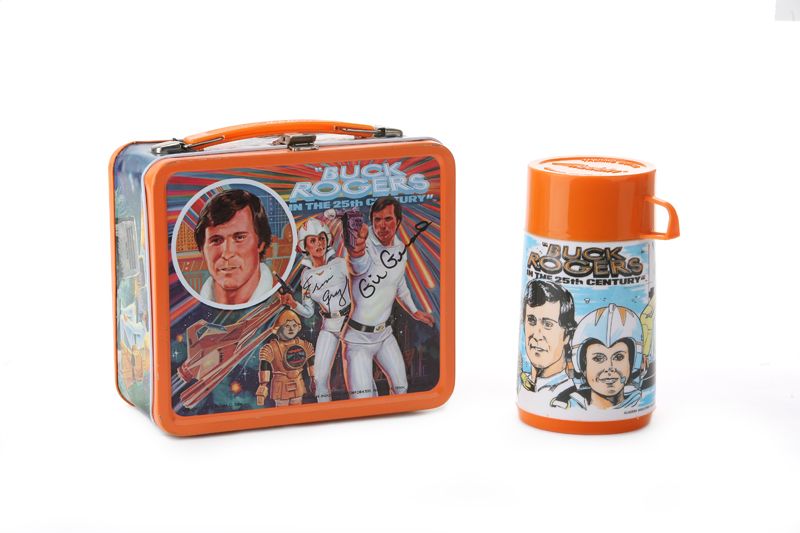 1979 Buck Rogers In The 25th Century Lunch Box with Thermos and original tag. Signed by Gil Gerard & Erin Gray. Minor paint loss from the orange trim.