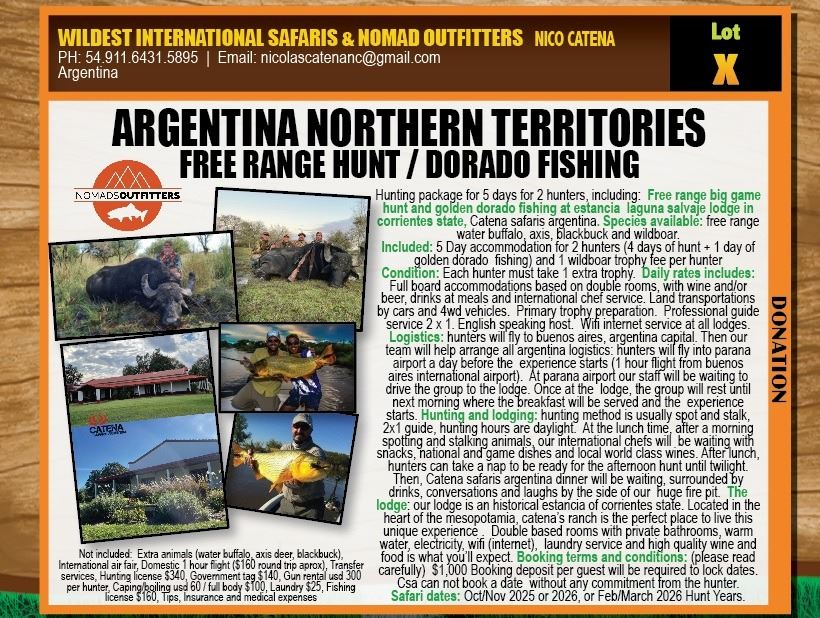 Catena Safaris donates Free Range Big Game Hunt and Golden Dorado fishing at Estancia, Laguna Salvage lodge in Corrientes State Argentina.