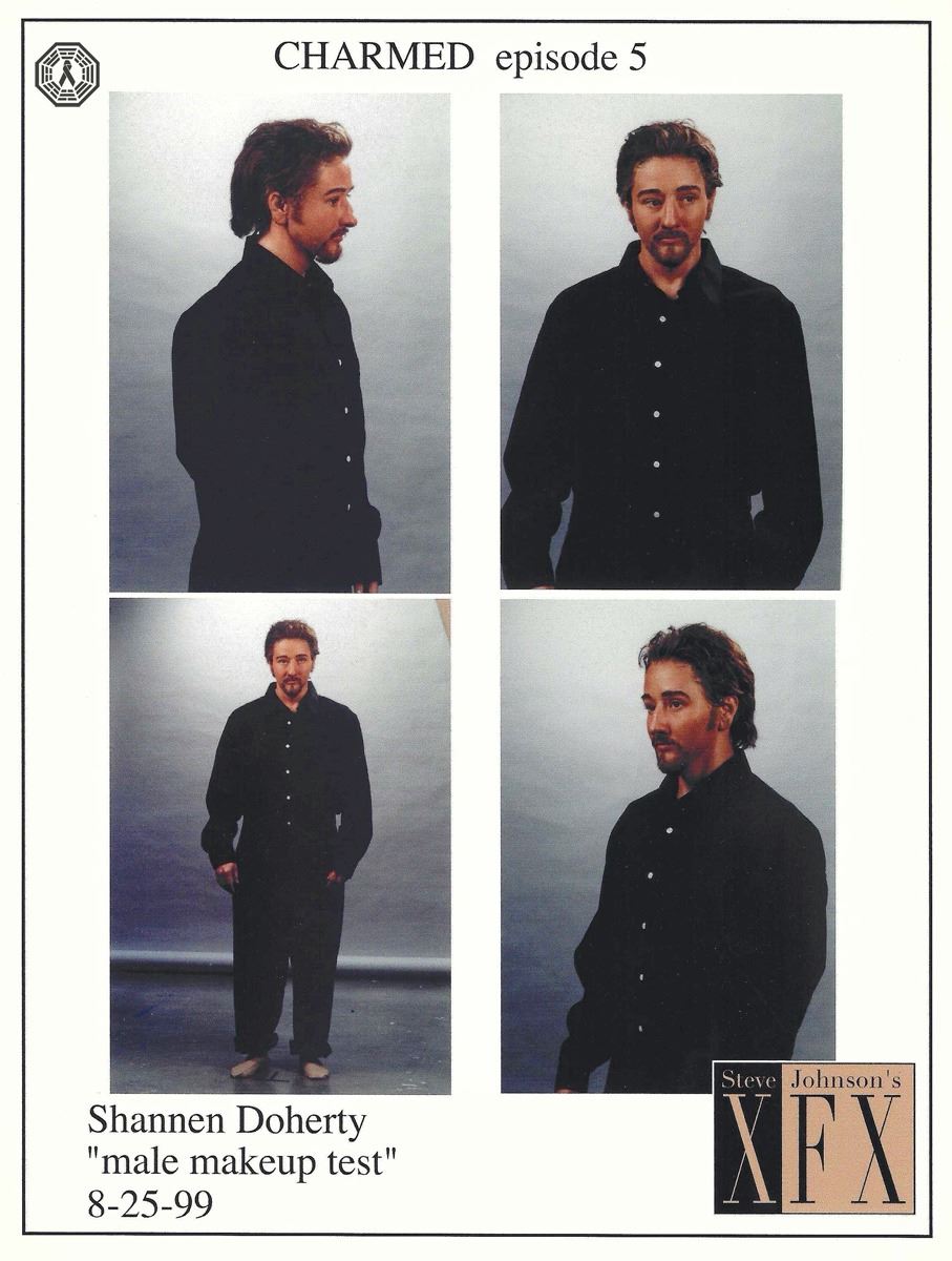 Charmed (original 1998-2006 series) Season 2 Episode 5 "She's a Man, Baby, A Man!" Shannen Doherty (Prue Halliwell) "male makeup test" photo set. Dated 8-25-99. Steve Johnson's XFX.