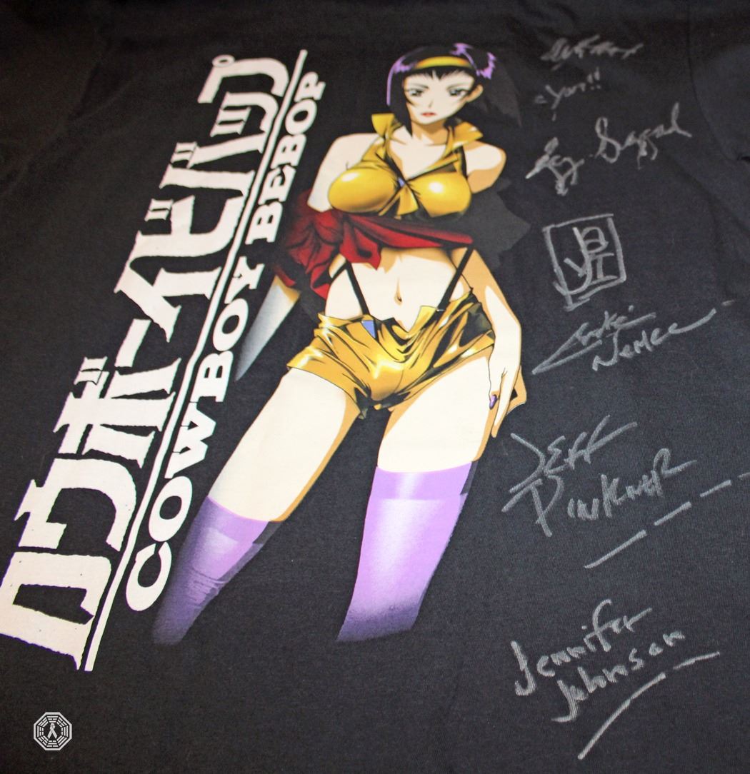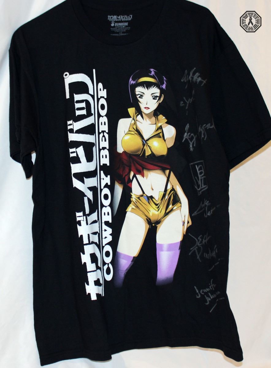 4) Cowboy Bebop t-shirt signed by 7 writers/producers! Javier Grillo-Marxuach, Alexandra Hartman, Jennifer Johnson, Andre Nemec, Jeff Pinkner, Liz Sagal and Christopher Yost. Size: Men's Large. Sunrise Funmation. 100% cotton. New, never worn. In good condition.