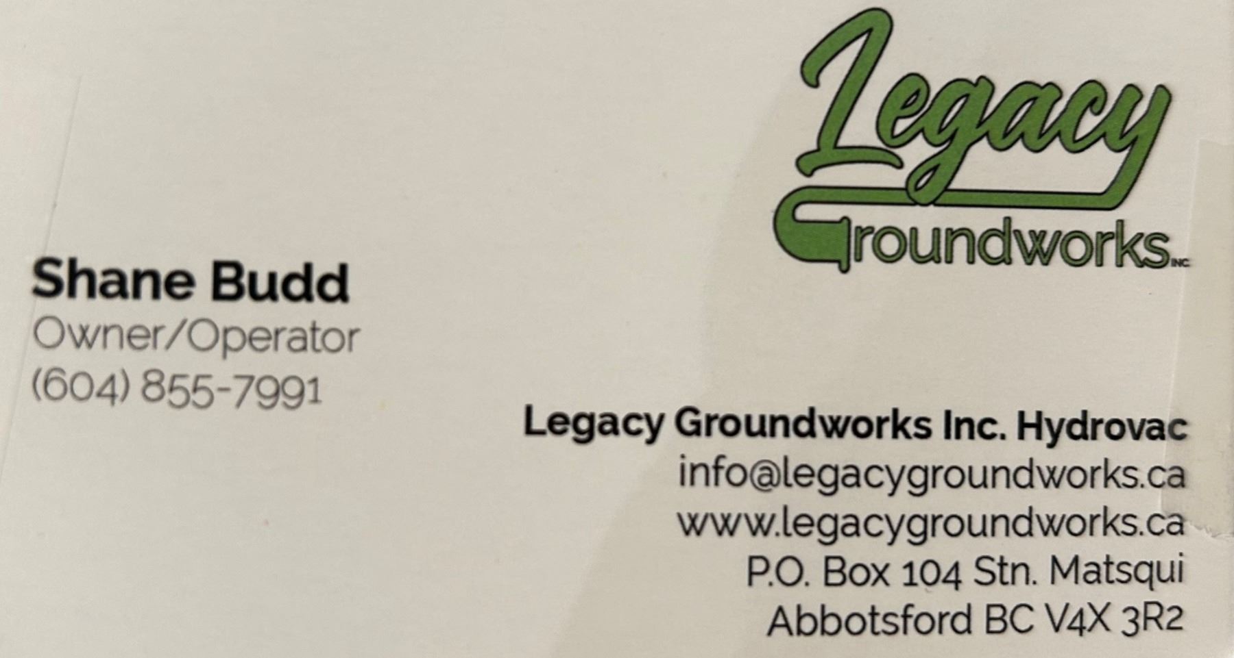Donated by: Legacy Groundworks Inc. Hydrovac, PPO Box 104 Stn. Matsqui, Abbotsford, BC.