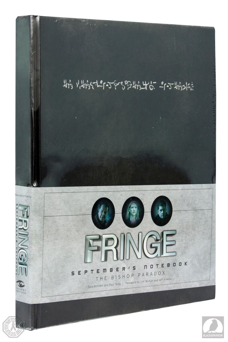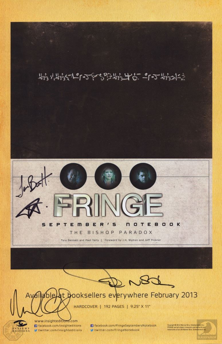 Fringe September's Notebook by Tara Bennett and Paul Terry, hardcover, 10" x 11.25", from Insight Editions. Sealed. 11" x 17" book promo poster signed by John Noble ("Walter Bishop") and Michael Cerveris ("The Observer"), and authors Tara Bennett & Paul Terry. In fine condition. Book donated by Jo Garfein. Poster donated by Carrie W.
