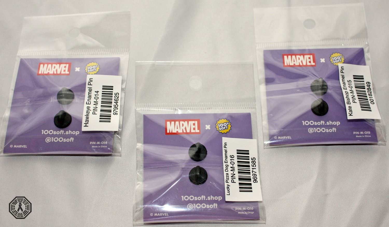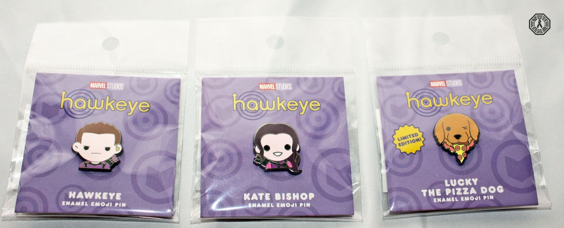 Hawkeye enamel emoji pin set: Hawkeye, Kate Bishop and Lucky the Pizza Dog. Marvel Studios. Created by 100% Soft. Each pin is .85" wide with black nickel plating and double rubber clutches.