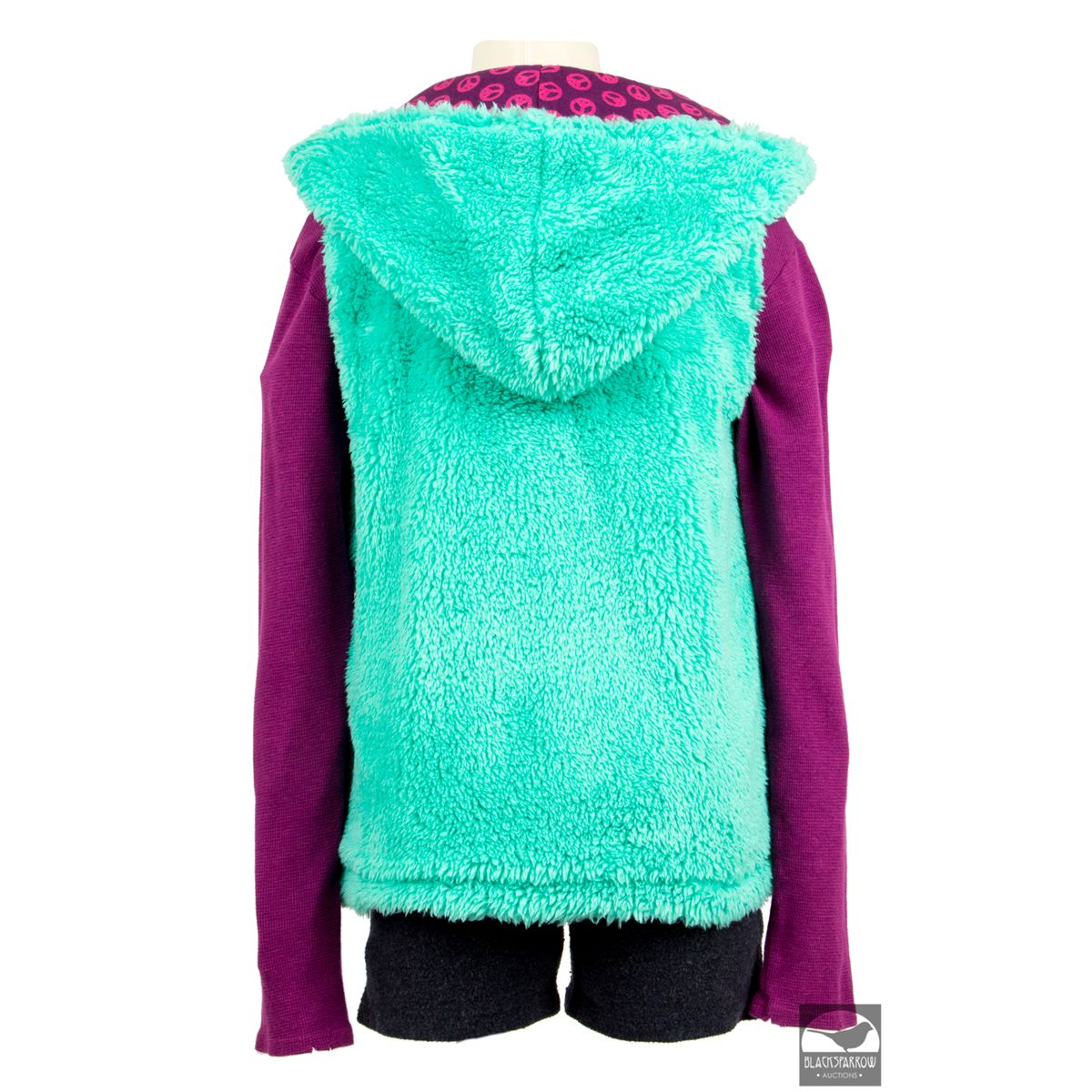 Purple thermal long sleeve shirt, gray shorts, turquoise fur hoodie vest and red striped ankle socks. Worn by Annie as portrayed by Quvenzhané Wallis in Annie. Includes costumer's tag indicting this costume was used in scenes 93 (int: Annie's Room). Moderately aged.