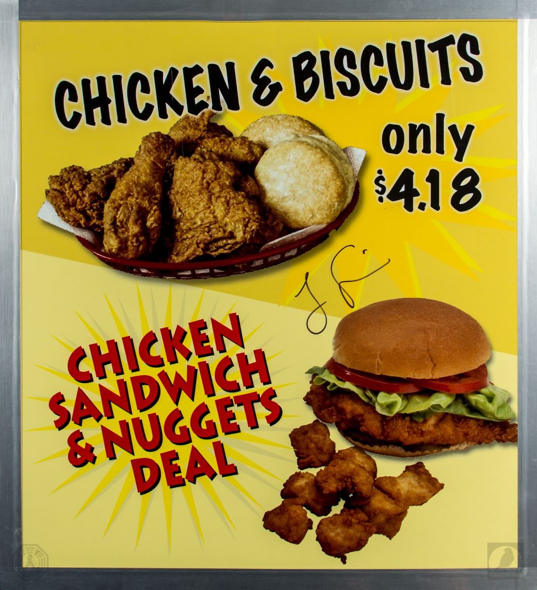LOST authentic Mr. Cluck's Chicken Shack screen-used sign prop on foam core, 22" x 24.5". Signed by Jorge Garcia ("Hurley"). In fine condition. Donated by John Bernstein.