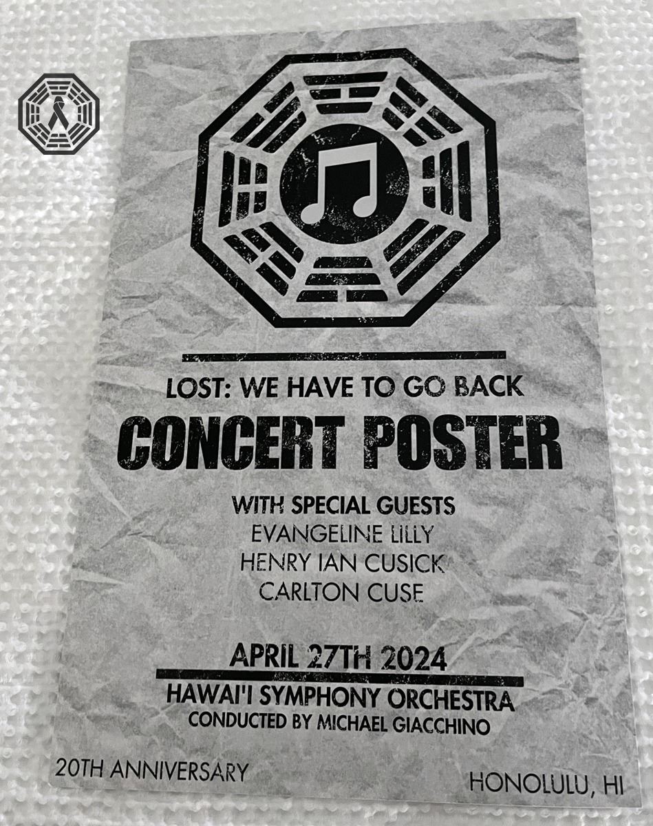 * LOST: We Have To Go Back Concert Poster. April 27, 2024. Hawai'i Symphony Orchestra Conducted by Michael Giacchino. Honolulu, HI. 10.75 x 16.75 inches. A few tiny dents along edges; will not show if framed. Otherwise in good condition.