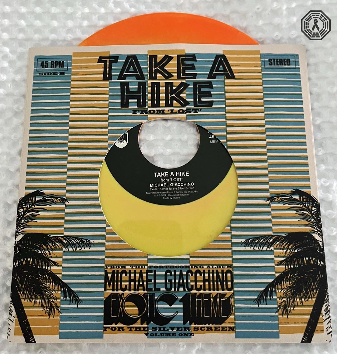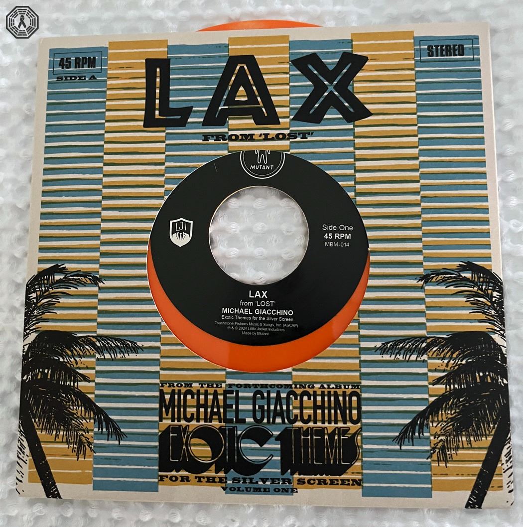 * LOST Michael Giacchino "LA X" theme (Side One) on mini vinyl 45 RPM. "Take a Hike" theme is on Side Two. From the forthcoming Michael Giacchino album: Exotic Themes For The Silver Screen Volume One. Made by Mutant. Touchstone Pictures Music & Songs, Inc. (ASCAP). 2024 Little Jacket Industries. New, in good condition.