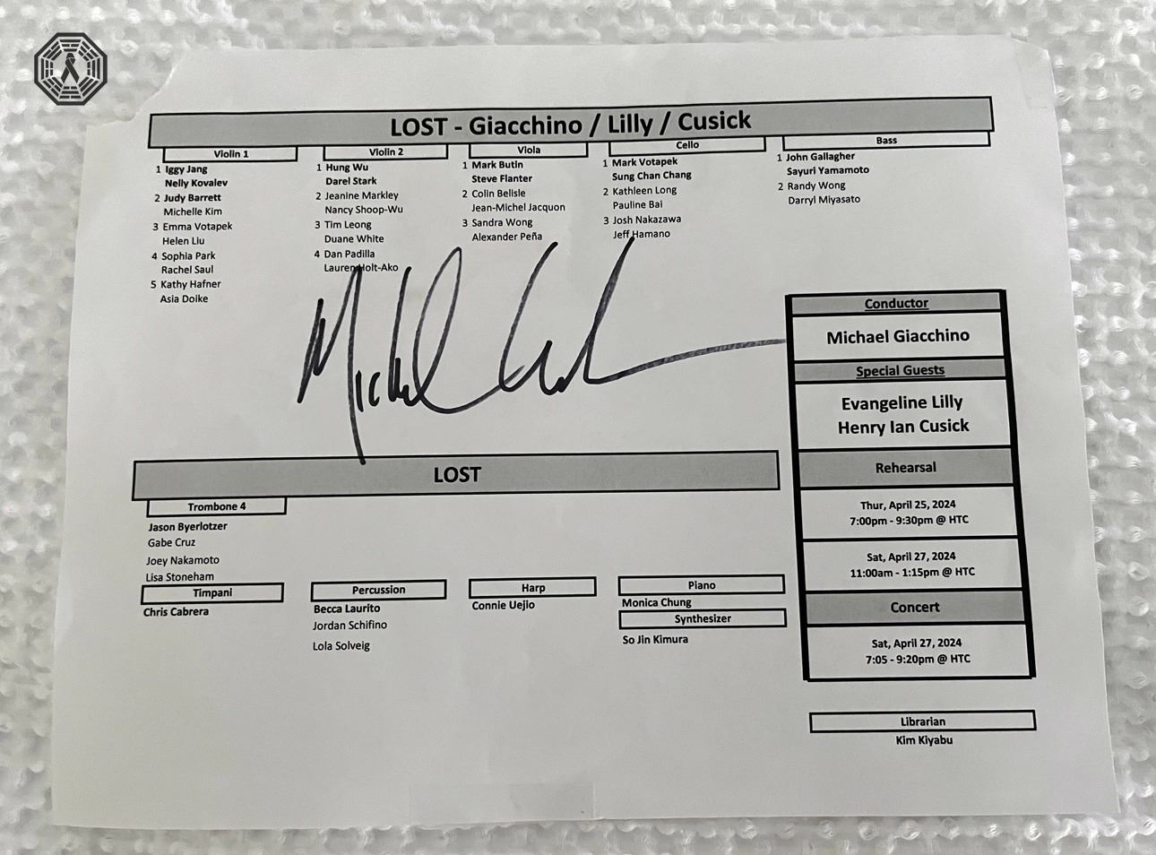 * Hawaii Symphony Orchestra org chart and LOST 20th Anniversary concert schedule. It was taped onto an orchestra music stand during the concert. Very rare! Upper left corner is torn off. Used, in fair condition. Donated and signed by Michael Giacchino!