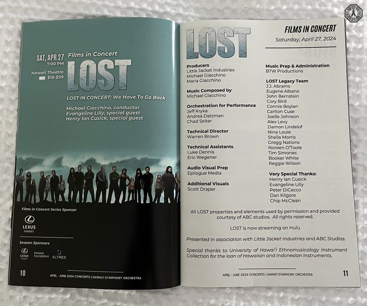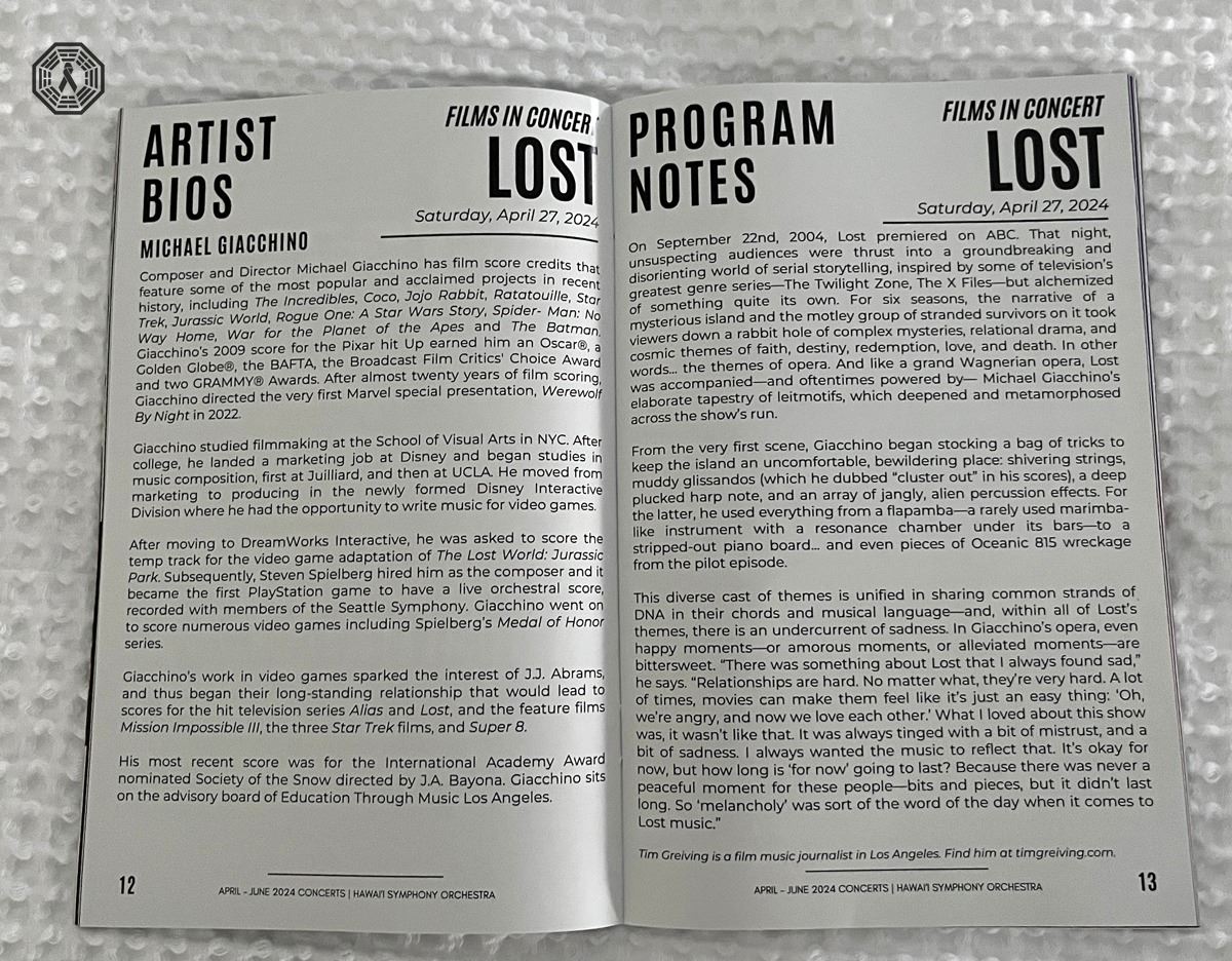 * Hawai'i Symphony Orchestra April-June 2024 program. Includes 4 pages dedicated to this LOST concert. In good condition.