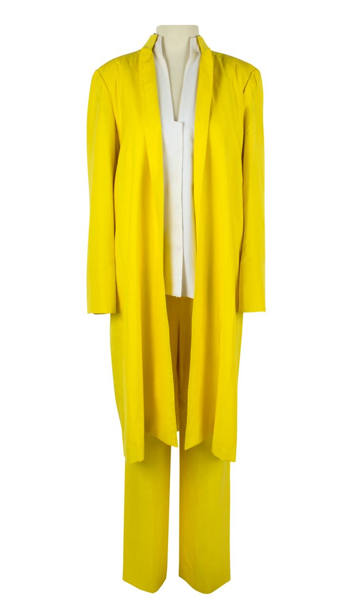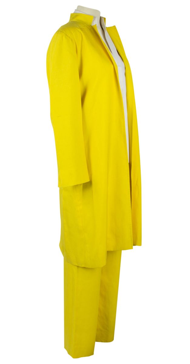 Lucille Ball's personal canary yellow three-piece pants suit was originally donated by Lucie Arnaz in the early 1990's to the Arts Council for Chautauqua County for a fundraising auction. The suit is made of silk with satin lining and the shirt is a cotton blend. No labels. From Lucille Ball's Beverly Hills closet. In fine condition.