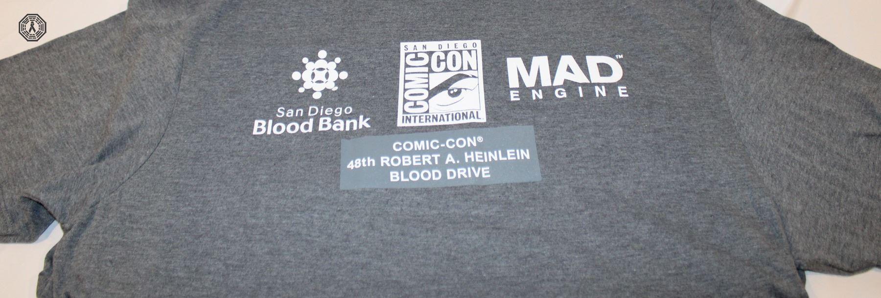 "San Diego Blood Bank, SDCC, Mad Engine, Comic-Con 48th Robert A. Heinlein Blood Drive" on back.