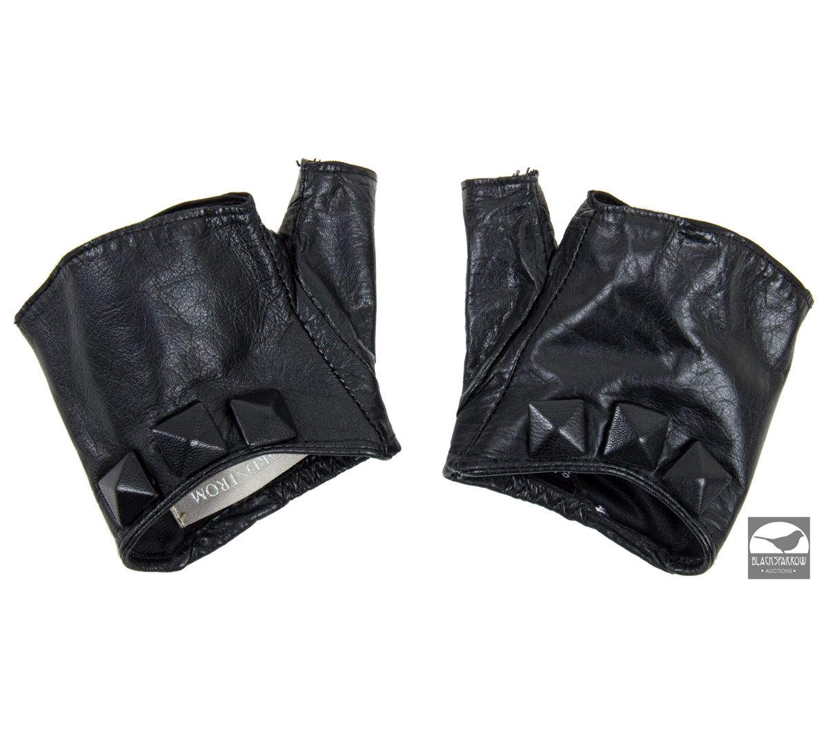 Nordstrom brand black leather fingerless gloves (size S/M) and LaDuca brand black leather boots (no laces, size 39). Worn by Miss Hannigan as portrayed by Cameron Diaz in AnnieI, in the final "parade" scene. Very moderately aged.