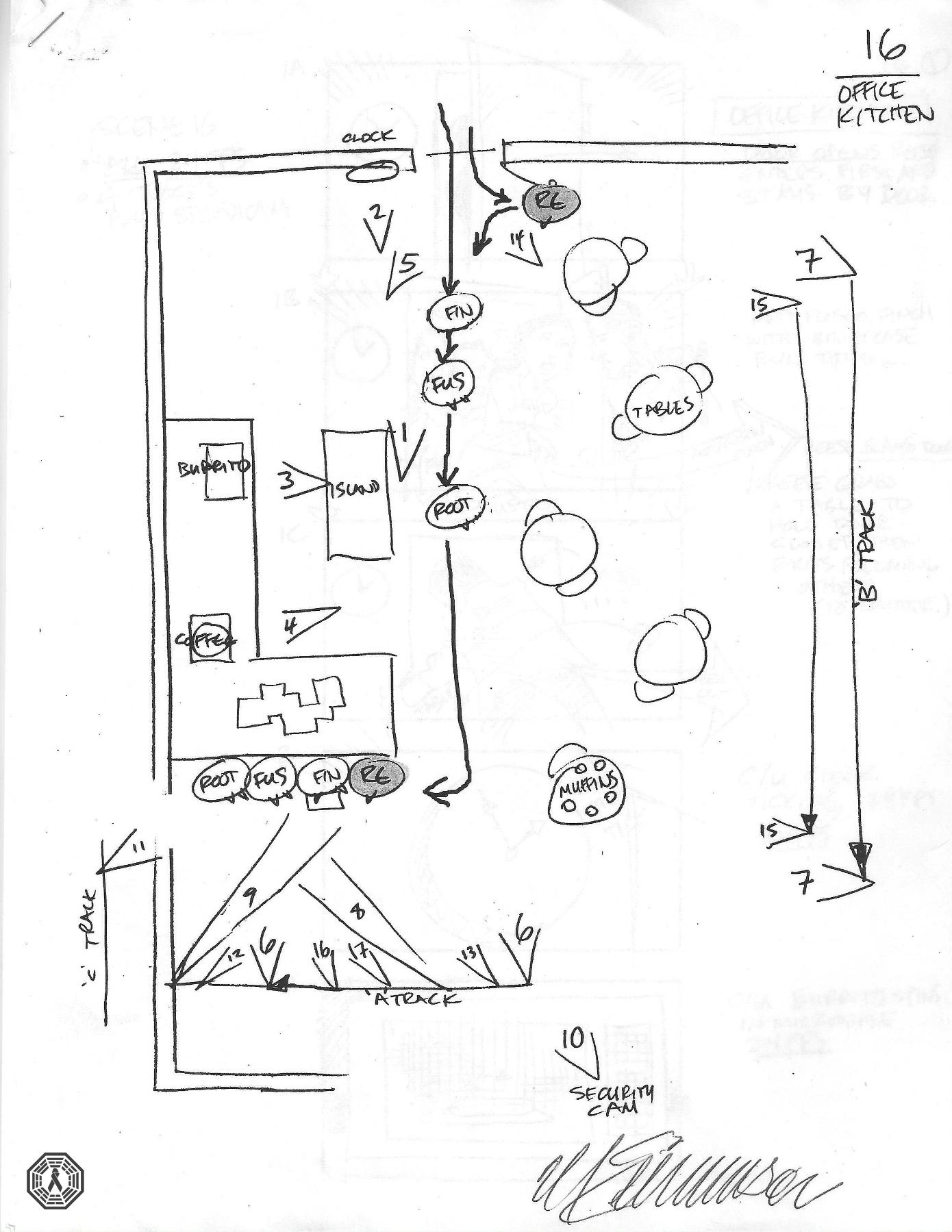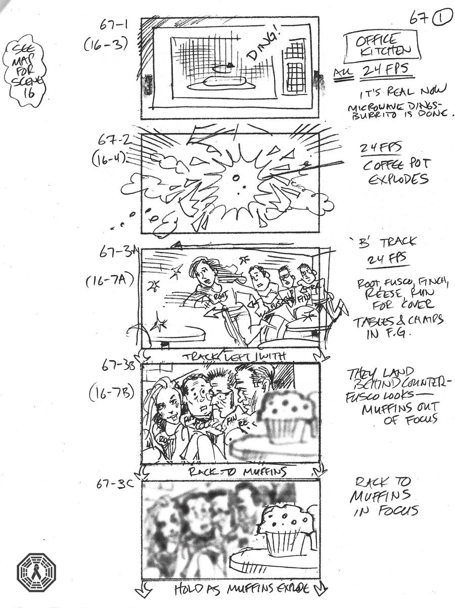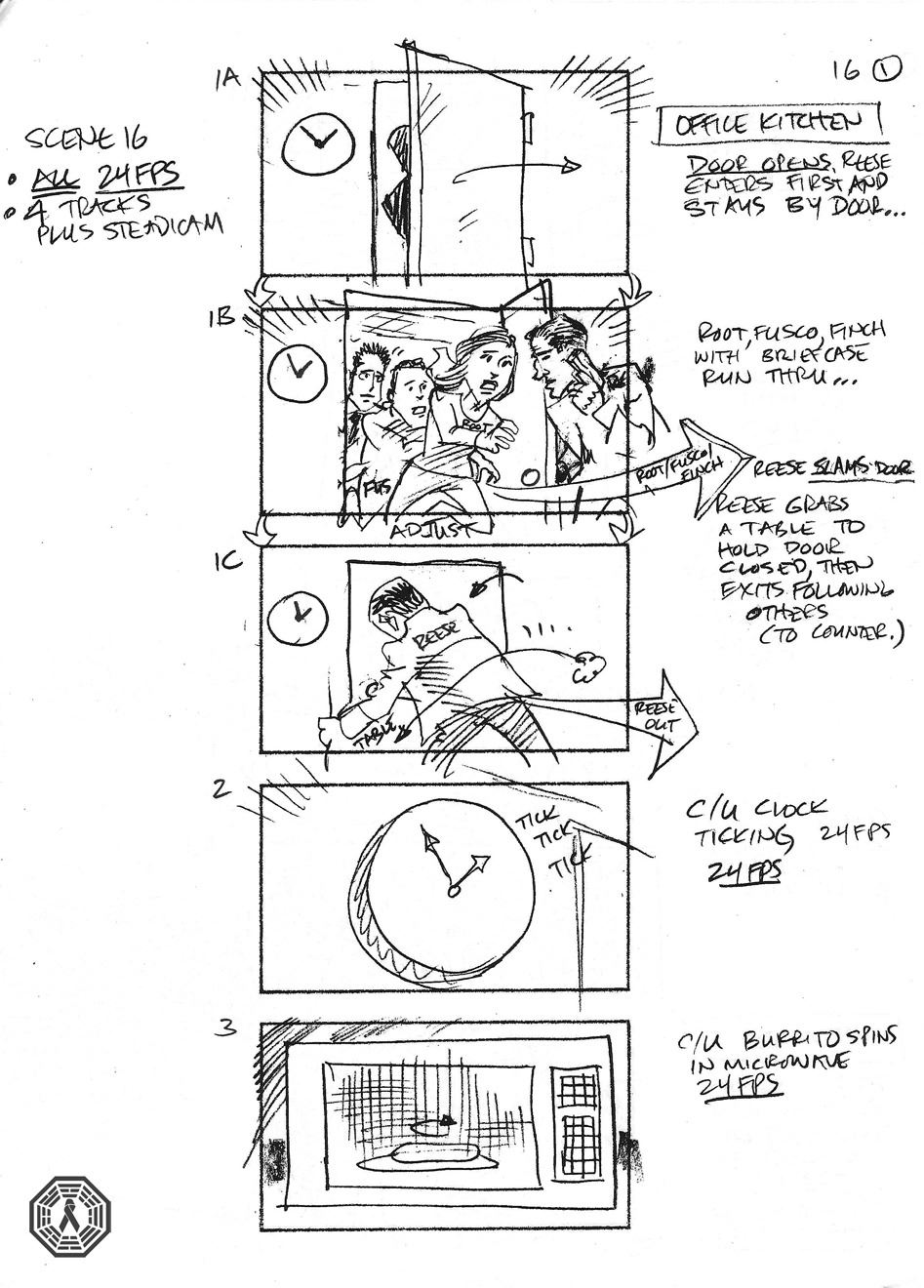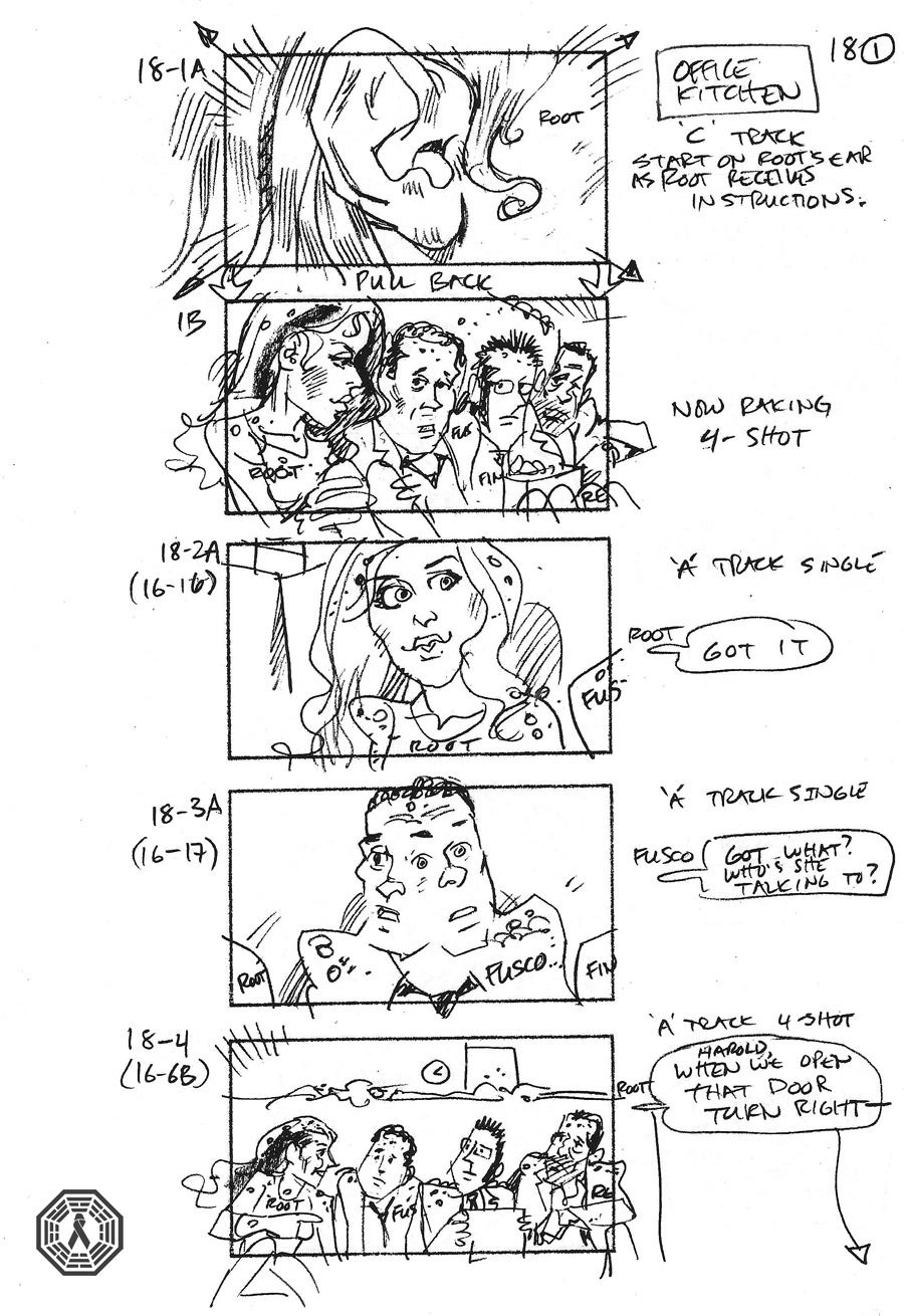 Person of Interest action sequence storyboards. 18 pieces of paper stapled together. Episode unknown.