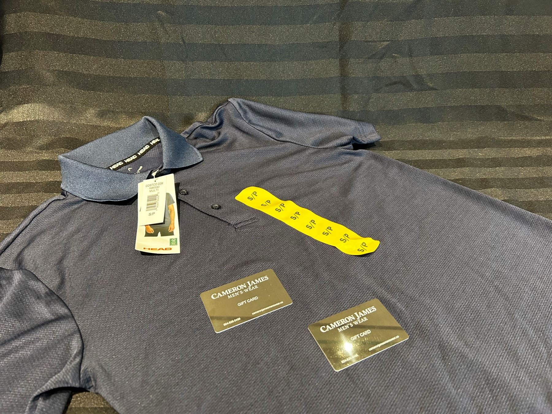 Step up your style or surprise someone with this perfect gift bundle! This auction includes $50.00 in gift cards to a top local menswear shop (Cameron James Men's Wear, Mission, BC) and a sleek HEAD performance polo shirt.