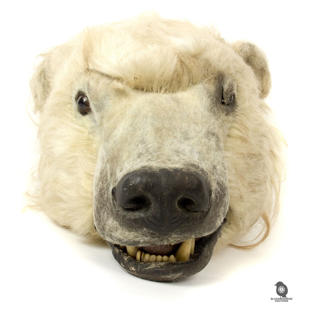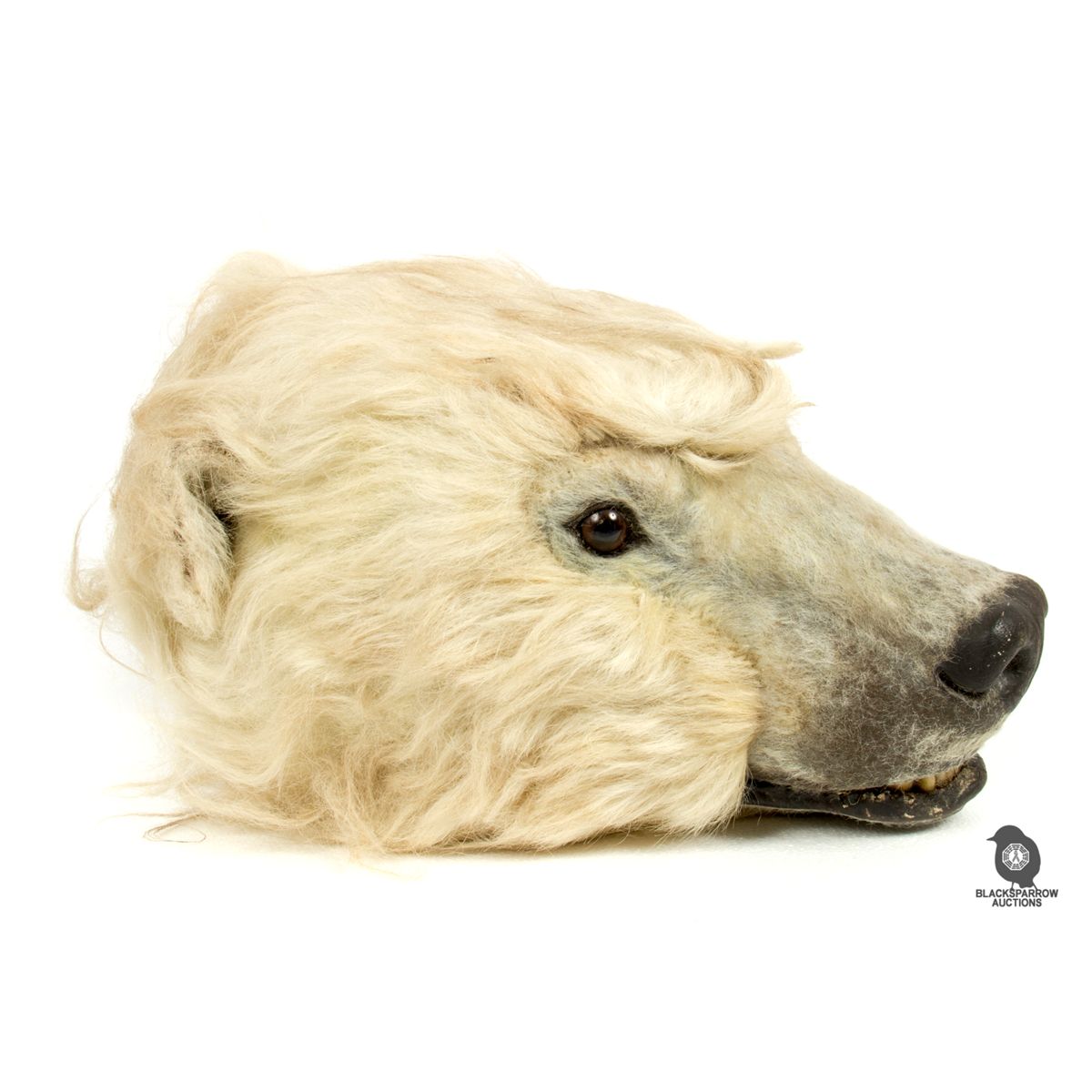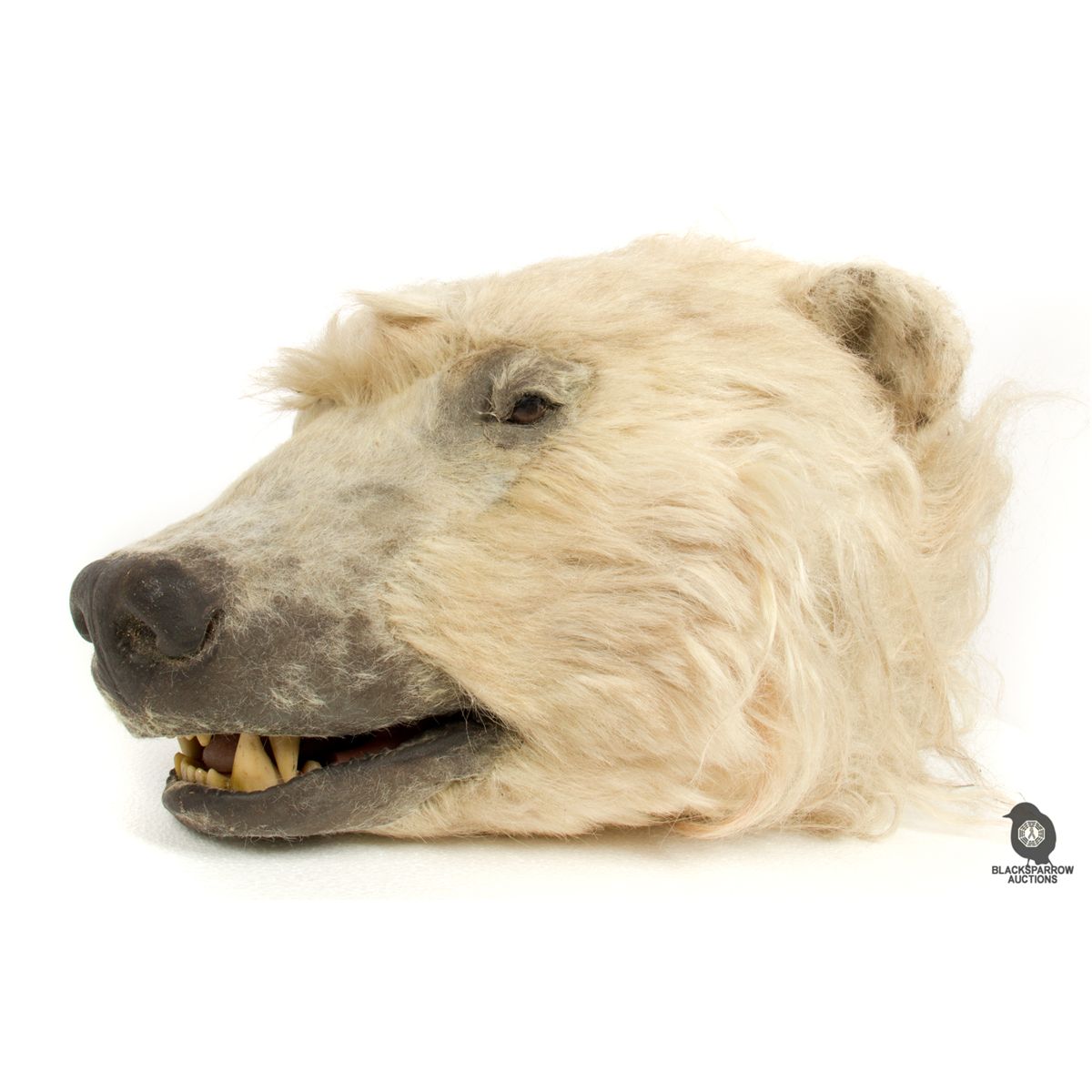Prop polar bear head and pair of claws made of foam and faux hair, as seen in the cave scene with Locke in the Season 3 episode, "Further Instructions," as well as other episodes. Only two polar bear props were created for the series, one being an animatronics version. This set of head and claws were used in conjunction with a bodysuit worn by a production crew member. Includes a certificate of authenticity from Animal Makers. Some moderate wear from usage. Otherwise, in fine display condition. From the Collection of Ken McMeans. **5% of final bid price will be donated to American Cancer Society.**