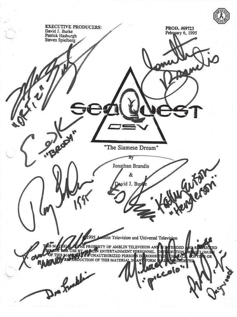 1) SeaQuest DSV "The Siamese Dream" script cover signed by Roy Scheider, Rosalind Allen, Jonathan Brandis, Michael DeLuise, Peter DeLuise, Kathy Evison, Don Franklin, Edward Kerr, Ted Raimi and Marco Sanchez! February 6, 1995. Amblin Television.