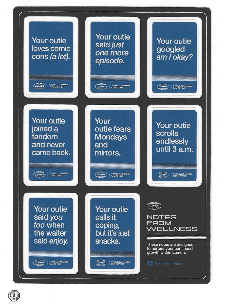 Severance “Notes From Wellness” stickers. Artist: Chris Maze. 5 x 7 inches.