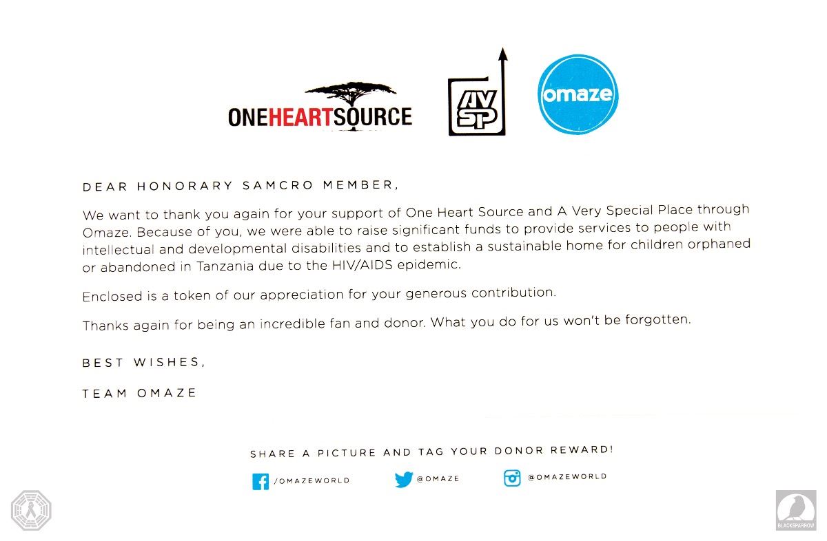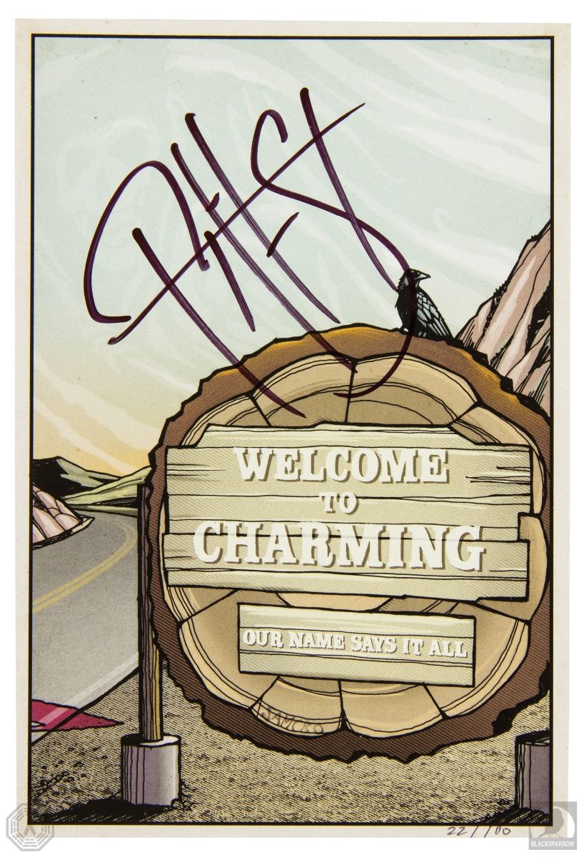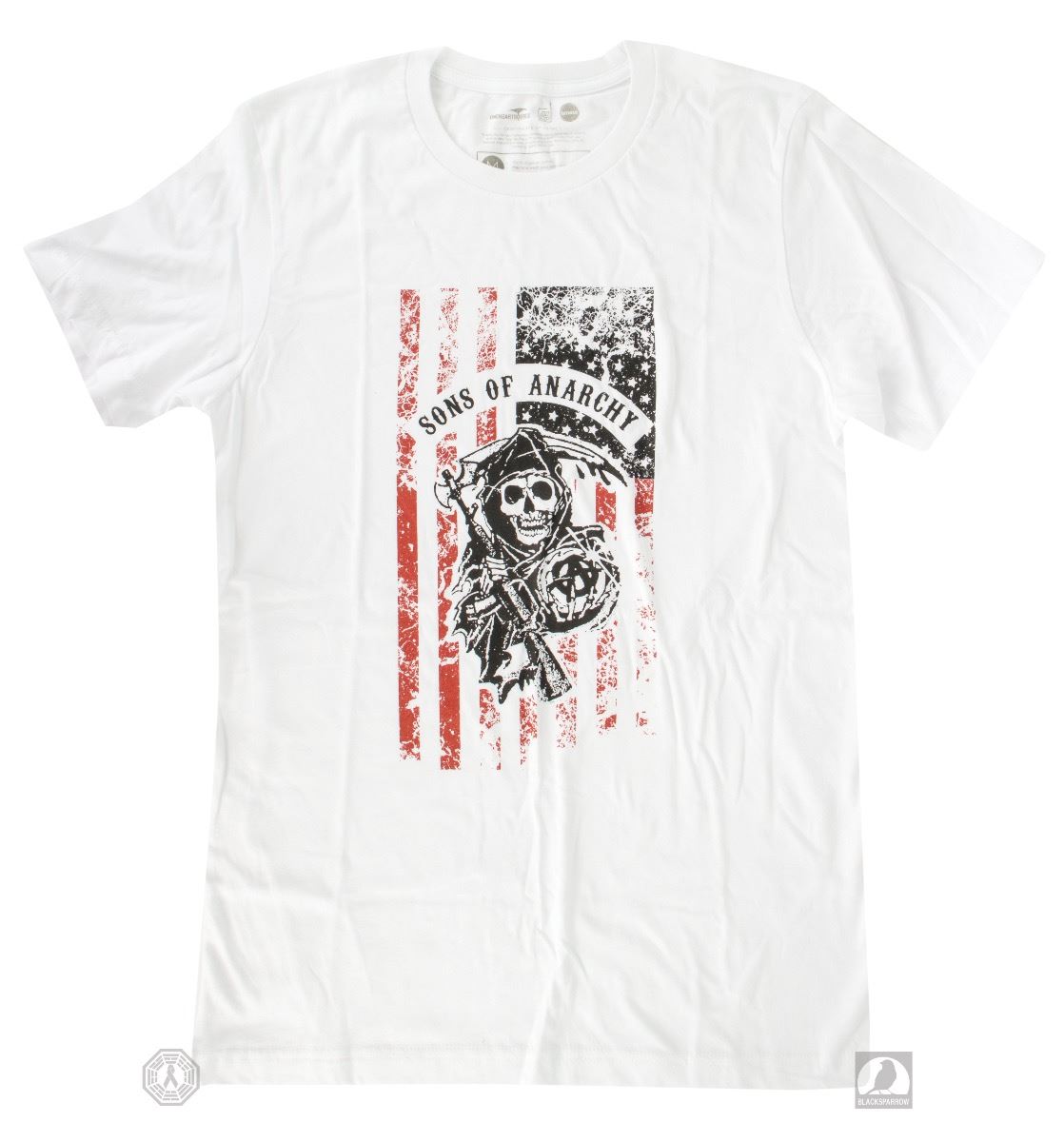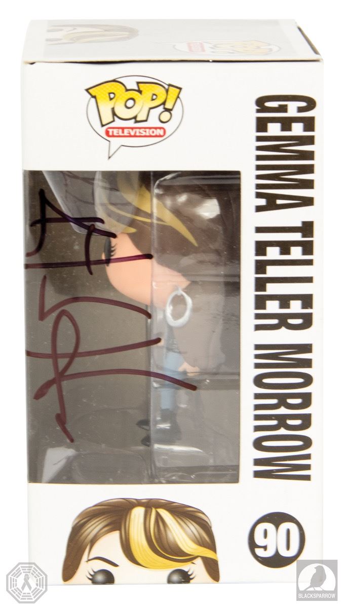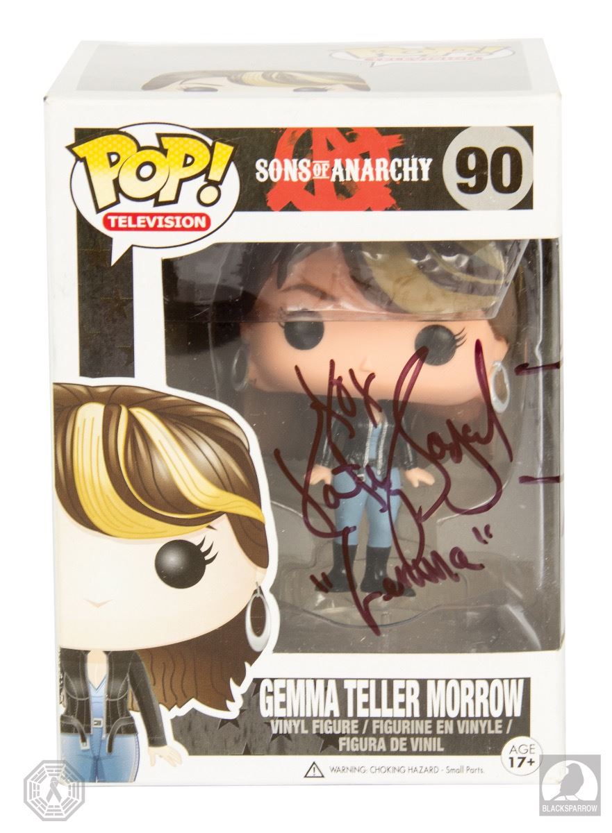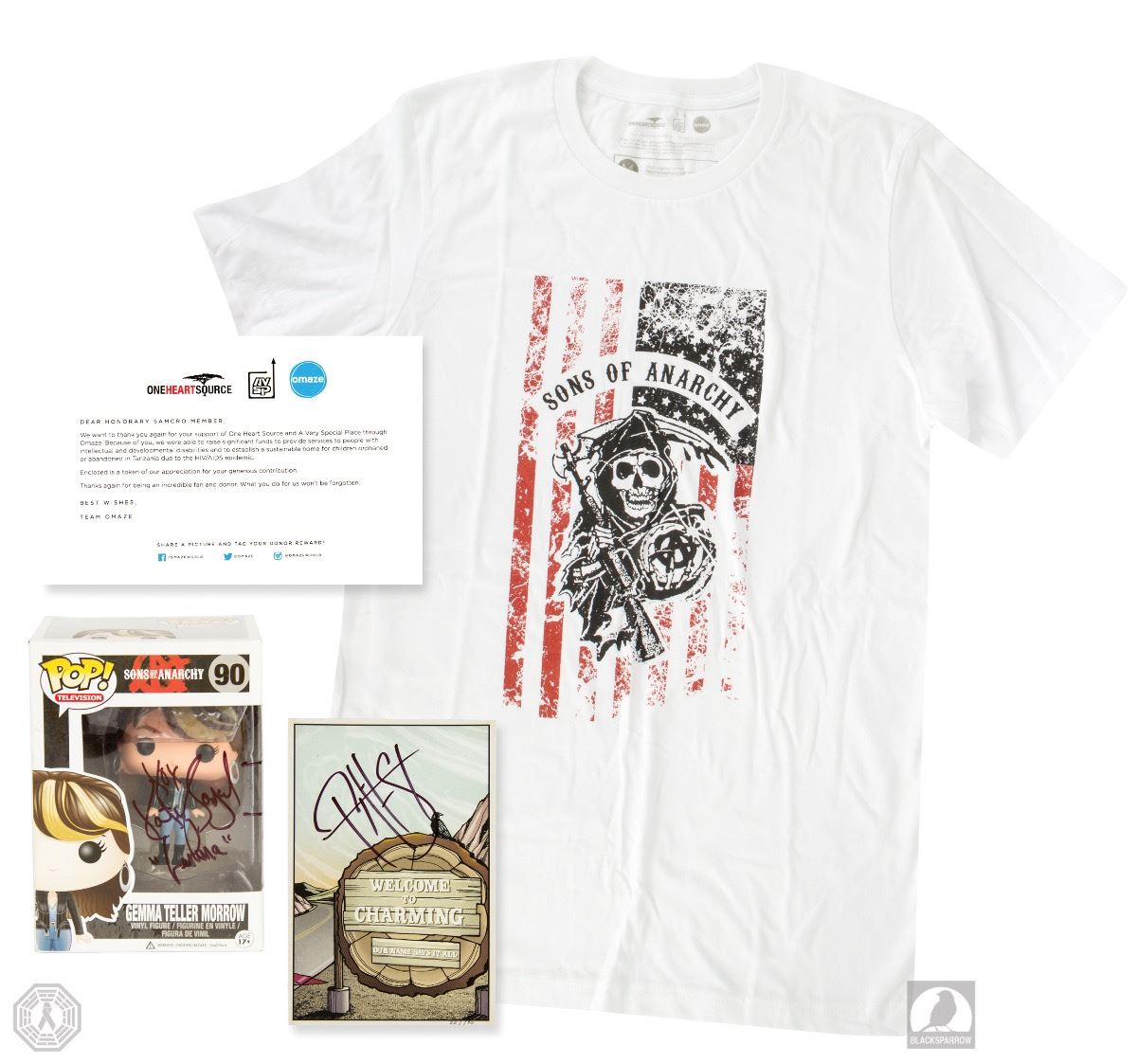 Sons of Anarchy OneHeart Source white t-shirt, size M, new and never worn, exclusive to Omaze campaign supporters (donated by Carrie W.). Sons of Anarchy Gemma Funko Pop! vinyl figure #90 signed by Katey Sagal ("Gemma Teller Morrow") and Executive Producer/Showrunner Kurt Sutter. Sons of Anarchy "Welcome to Charming" limited edition postcard art print (#22/100, artist: Clinton Reno), signed by Ryan Hurst ("Opie"). All items are in fine condition. Donated by Jo Garfein.