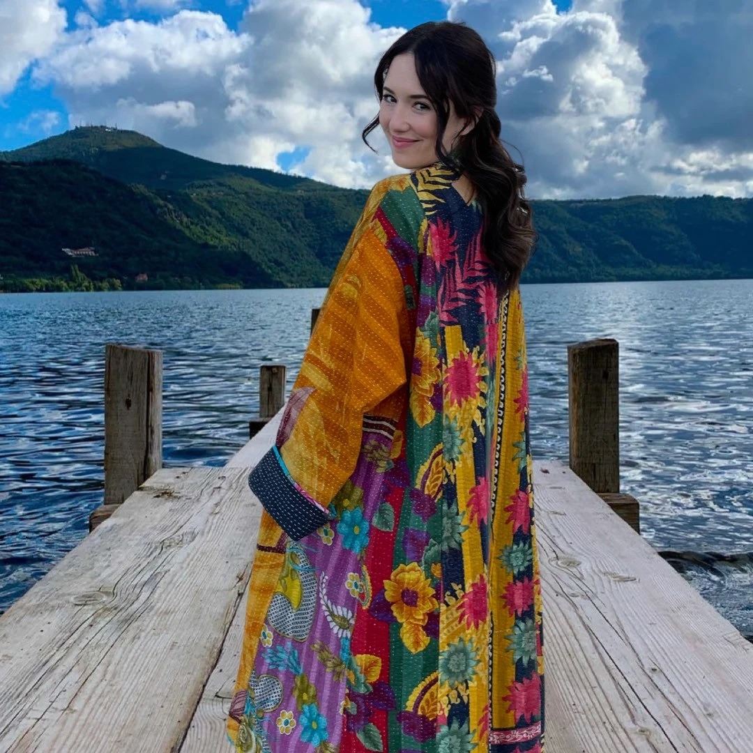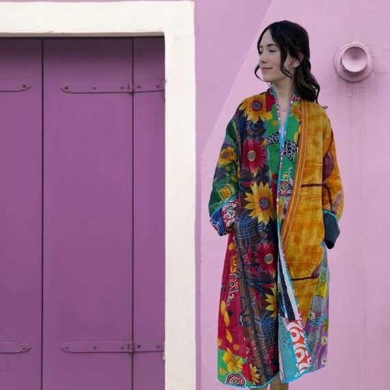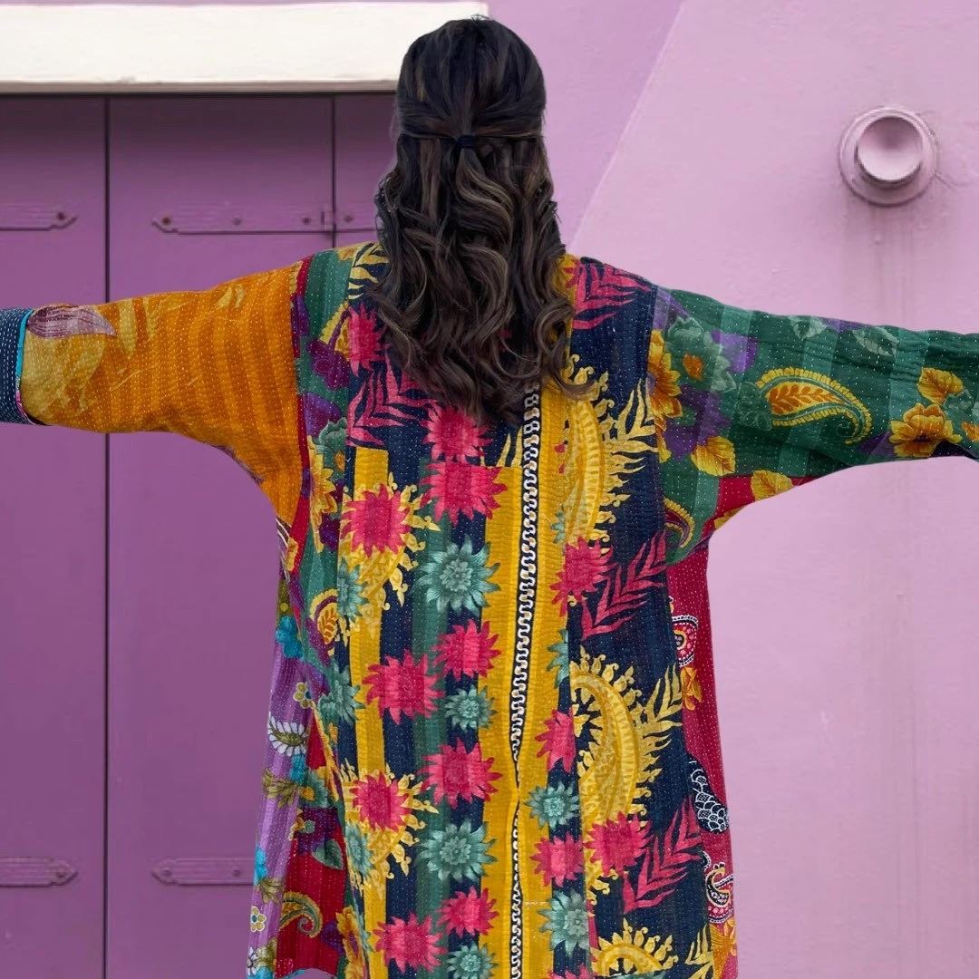 One of a kind reversible cotton Gudri kantha jacket made from carefully curated vintage cotton quilts. This is a one of a kind designed by Lisa Finkelstein and the jacket in the photo is the exact jacket you will receive. This is one size and will fit anyone from a size 6 up to size 2X.