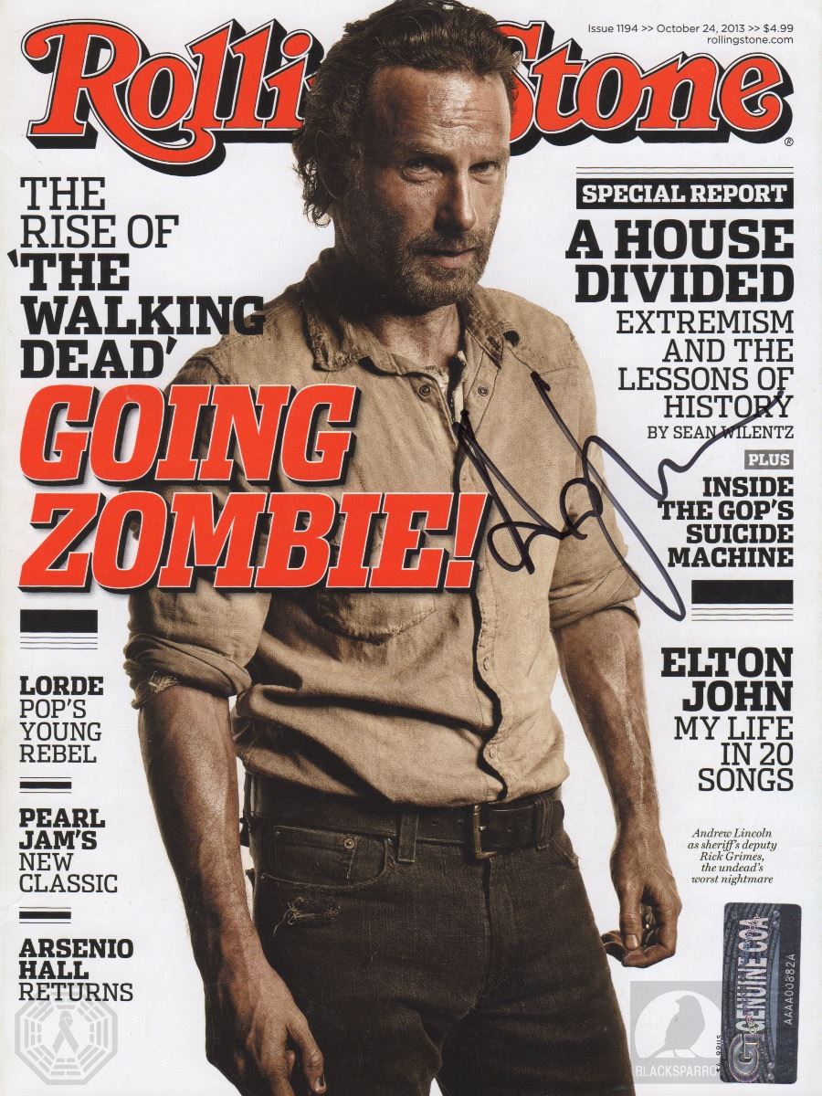Rolling Stone Magazine issue #1194 (October 24, 2013) featuring The Walking Dead cover with Rick Grimes. Signed by Andrew Lincoln ("Rick Grimes"). Comes with a Genuine COA certificate of authenticity. In fine condition. Donated by Walker Stalker Con.