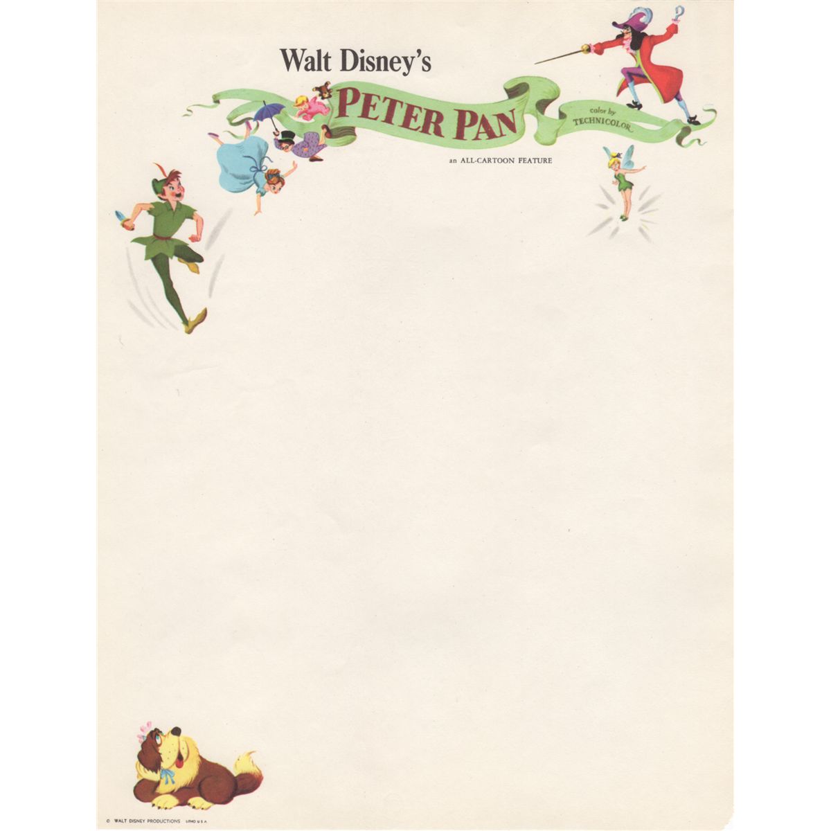 Original 8 1/2" x 11" letterhead stationery created for Walt Disney to use in correspondences to promote this classic feature. Peter Pan with Tinker Bell and Captain Hook are featured in full color at the top of the Disney corporate letterhead. Small tear at the lower right corner. Otherwise, in very good condition.