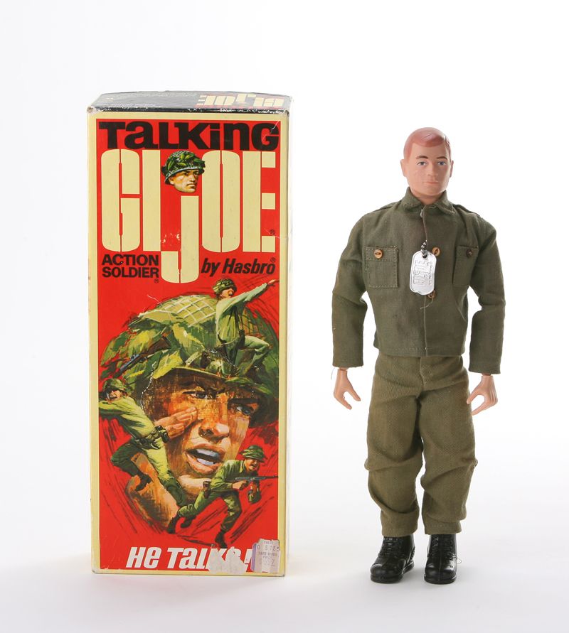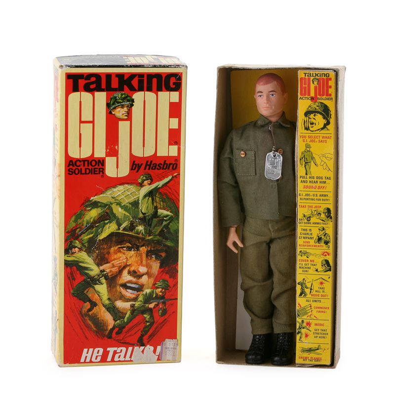1967 12" Talking G.I. Joe Action Soldier by Hasbro, in original box. Complete with doll, uniform and boots. The shirt is missing a button. Voice slightly distorted. General instructions and boot removal instructions included. Box shows moderate wear. Portion of box surface missing. Overall, in good condition.