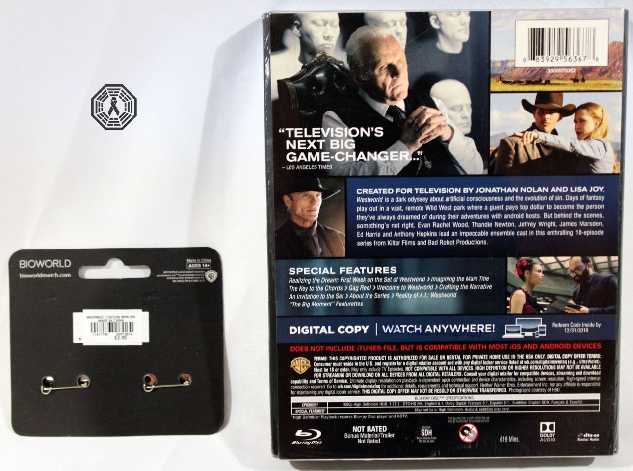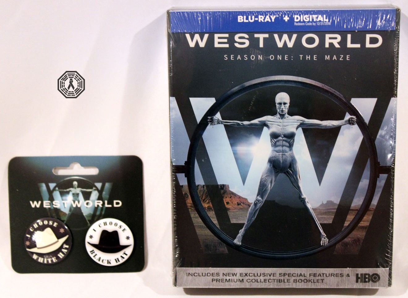 Westworld Season 1 Blu-ray and pin set. Donated by Anonymous.